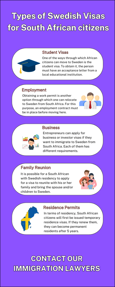 If you are looking to relocate to Sweden from South Africa and have any questions, do not doubt in asking our lawyers for support. Most visas lead to obtaining a residence permit in Sweden.